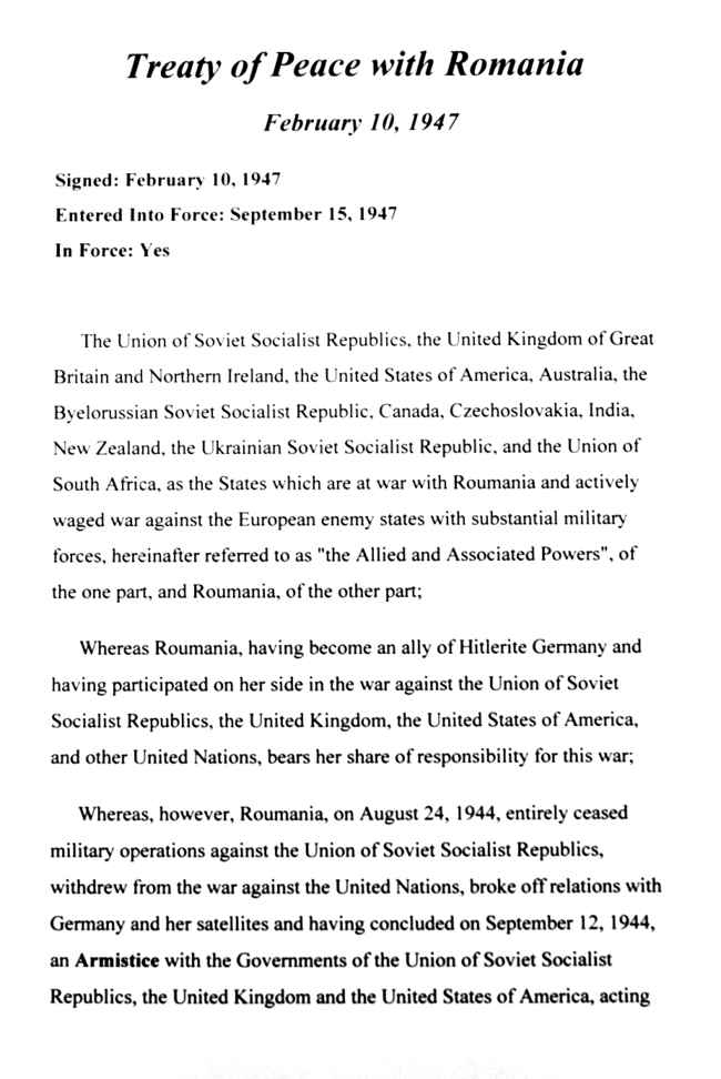 反法西斯同盟国和罗马尼亚缔结的和约。1947年《巴黎和约》的组成部分。1947年2月10日,苏联、英国、美国、澳大利亚、白俄罗斯、加拿大、捷克斯洛伐克、印度、新西兰、乌克兰、南非联邦与罗马尼亚在巴黎签订。同年9月15日生效。共8部分40条。主要内容有:①罗疆界以1941年1月1日疆界为准;依照1...