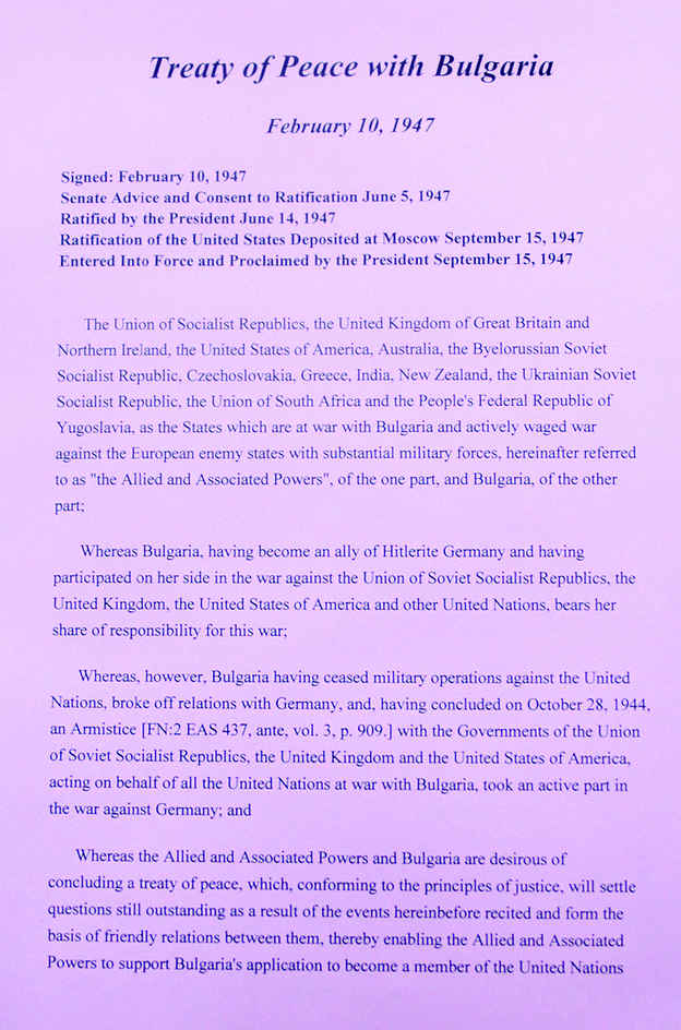 反法西斯同盟国和保加利亚缔结的和约。1947年《巴黎和约》的组成部分。1947年2月10日,苏联、英国、美国、澳大利亚、白俄罗斯、捷克斯洛伐克、希腊、印度、新西兰、乌克兰、南非联邦、南斯拉夫联邦与保加利亚在巴黎签订。同年9月15日生效。共8部分38条。主要内容有:①保恢复1941年1月1日疆界。...