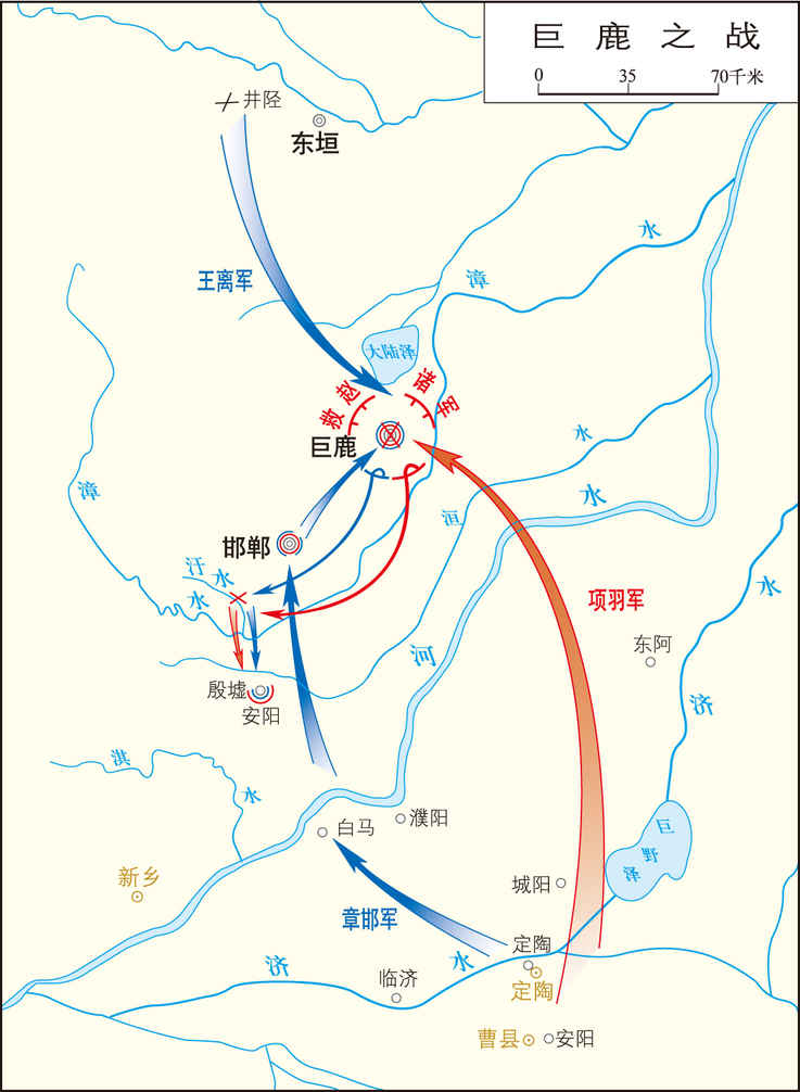 秦二世三年(前207),反秦名将项羽率领楚地义军歼灭秦军章邯、王离主力的重大作战。 秦二世二年,秦将章邯镇压陈胜、吴广起义,击杀楚地反秦武装首领项梁后,率兵20万渡河(黄河),配合由上郡(郡治肤施,今陕西榆林东南)急调至河北的秦将王离击赵,攻破邯郸(今属河北)。赵地反秦武装首领赵王歇及张耳退保...