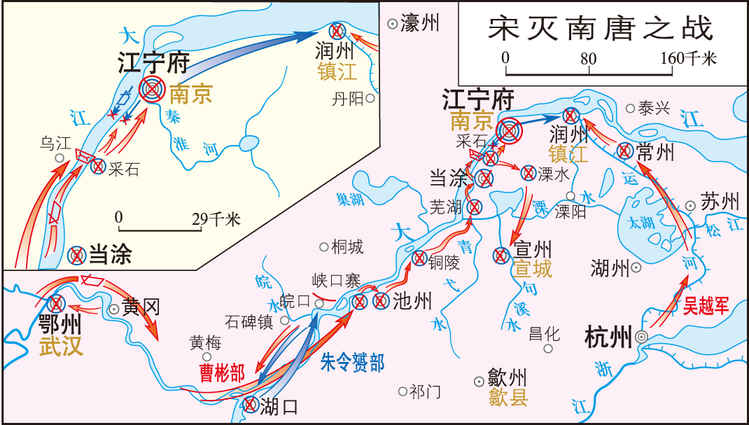 宋开宝七年至八年(974~975),宋太祖赵匡胤遣军进攻江宁(今南京),灭亡南唐的作战。 宋灭南汉后,南唐后主李煜为求自保,主动向宋提出削去国号,称江南国主,表示臣服;暗中却募兵备战,将兵力部署在长江中下游南岸各要地,以防宋军进攻。赵匡胤在灭亡南汉后,即作攻取南唐准备:施离间计,使李煜错杀其大...