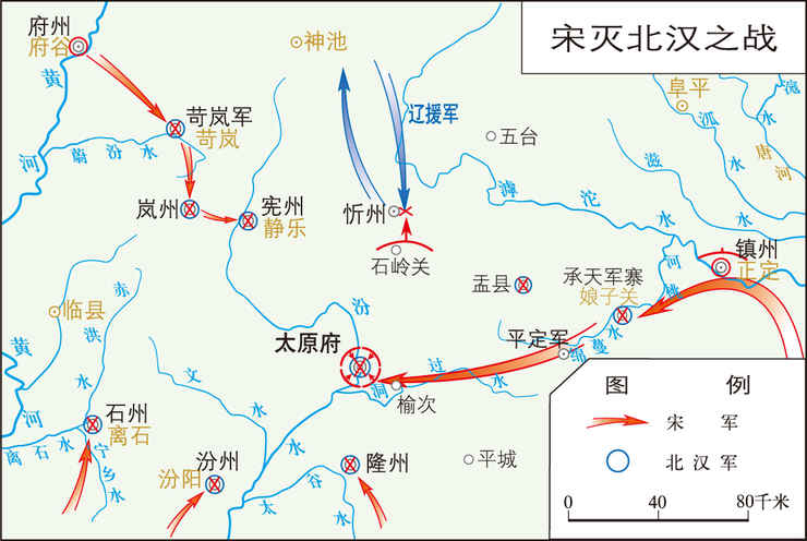 宋太平兴国四年(979),宋太宗赵光义率军攻灭北汉的作战。 宋在完成对南方的统一后,宋太宗赵光义继承太祖赵匡胤的未竟之志,决意攻灭北汉。鉴于太祖三次率军往攻北汉,皆因辽军南援北汉而失败,遂制定肃清外围、先阻辽援、后取太原的方略。继而,加紧整训军队,命邻近北汉的晋、潞(今山西临汾、长治)、邢、镇...