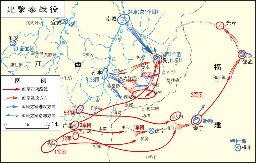 土地革命战争时期,中国工农红军第一方面军在闽赣边界的建宁、黎川、泰宁地区对国民党军的进攻战役。 1932年10月,国民党军对鄂豫皖苏区、湘鄂西苏区第四次“围剿”基本结束,开始布置对中央苏区的第四次“围剿”。此时,在中央苏区周围地区约有国民党军20个师,而在赣闽边界的建宁、黎川、泰宁、邵武、光泽...