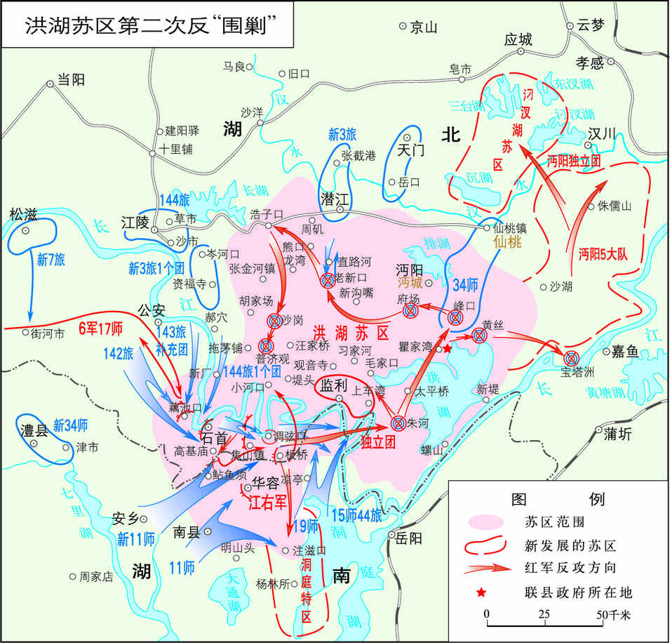 土地革命战争时期,湖北、湖南两省边界的洪湖苏区军民反击国民党军第二次“围剿”的作战。 1931年3月1日,国民党军第10军军长、湘鄂川边区“清乡”督办徐源泉指挥近4个师的兵力,以洪湖苏区江南地区为重点,发动第二次“围剿”。其第48师第142旅及第143旅一部分由公安(今公安南平)、郝穴(今...