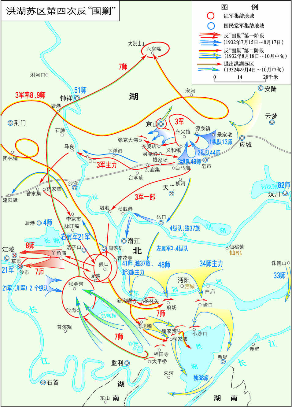 土地革命战争时期,湖北、湖南两省边界的洪湖苏区军民反击国民党军第四次“围剿”的作战。 1932年5月,蒋介石亲任豫鄂皖三省“剿匪”总司令,调集约50万兵力,组成左、中、右3路军,准备对鄂豫皖、湘鄂西两苏区发动第四次“围剿”。6月,其左路军10余万人,由武汉“绥靖”公署主任何成浚兼任司令官,第1...