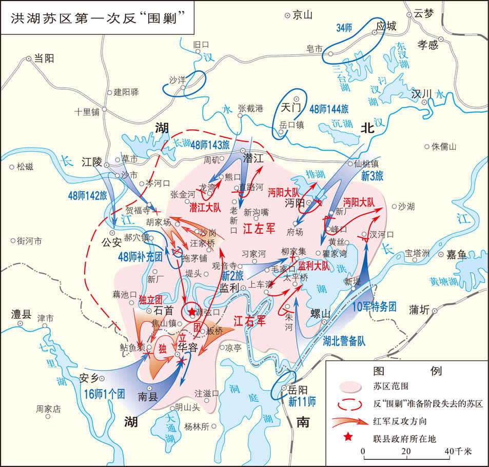 土地革命战争时期,湖南、湖北两省边界的洪湖苏区军民反击国民党军第一次“围剿”的作战。 1930年10月,洪湖苏区发展到拥有湖北省监利、沔阳(今仙桃)、潜江、公安、石首和湖南省华容、南县7座县城,控制着岳阳、沙市间长江两岸大片乡村,纵横达百余千米。11月,国民党军第10军军长、湘鄂川边区“清乡”...