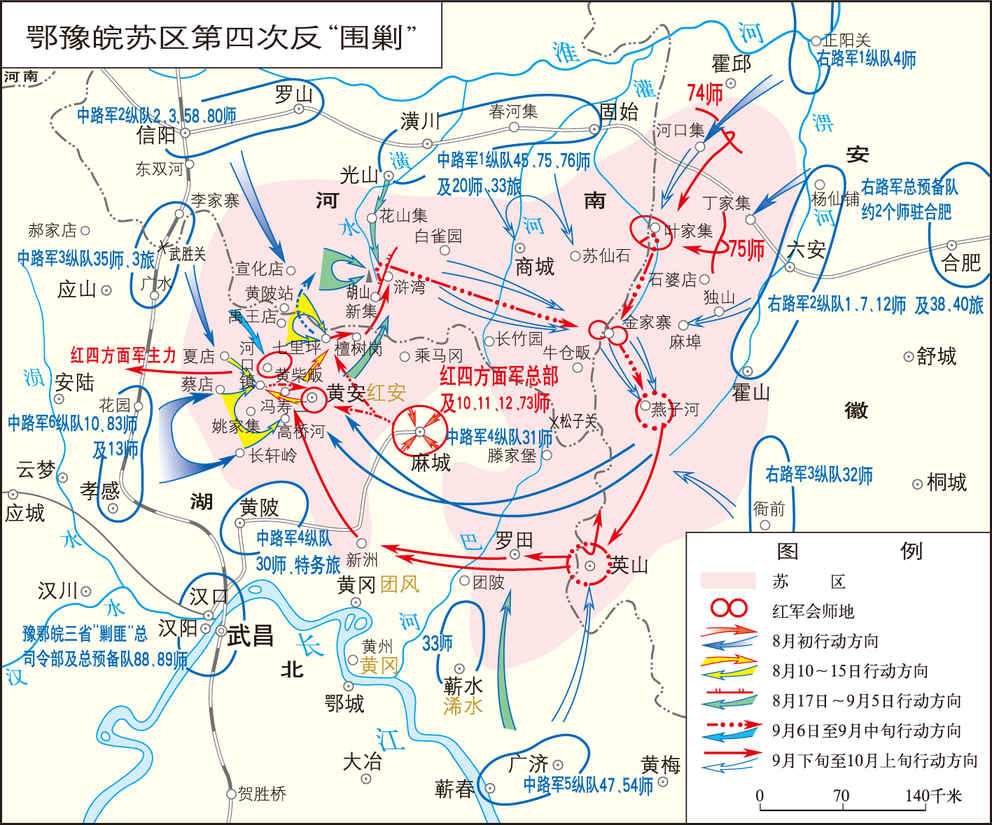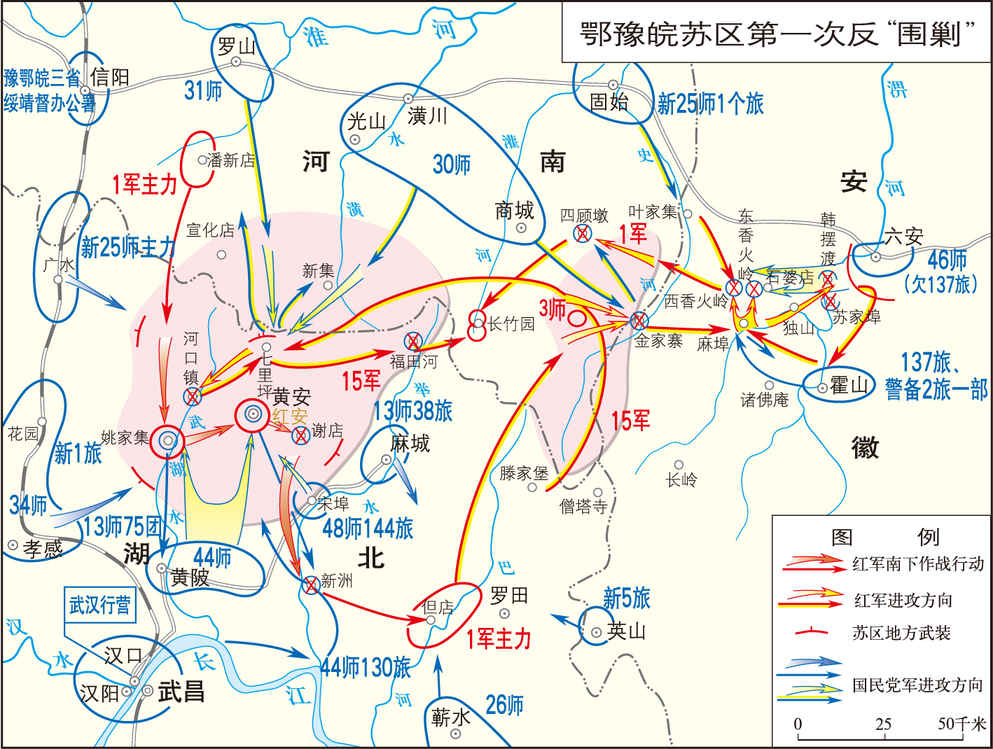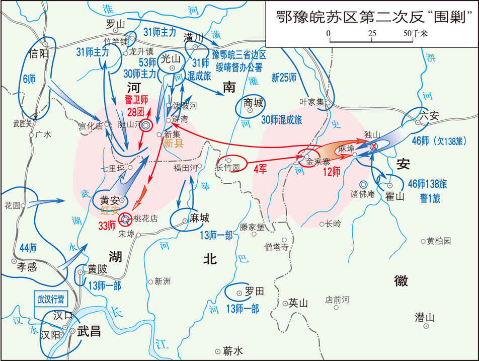 土地革命战争时期,中国工农红军第4军在鄂豫皖苏区反击国民党军大规模“围剿”的作战。 1931年3月中旬,国民党武汉行营主任何成浚、豫鄂皖边区“绥靖”督办李鸣钟,调集8个师另2个旅共10余万人的兵力,采用追堵兼施的战法,组织对鄂豫皖苏区第二次“围剿”,企图于5月底前“完全肃清”苏区内的红军。其部...