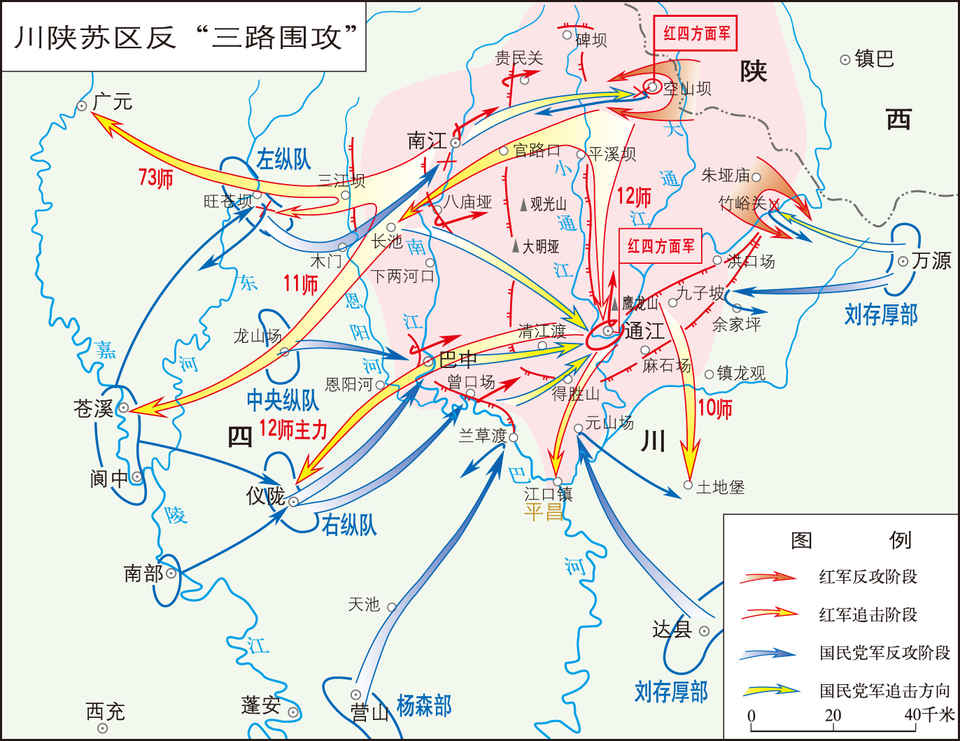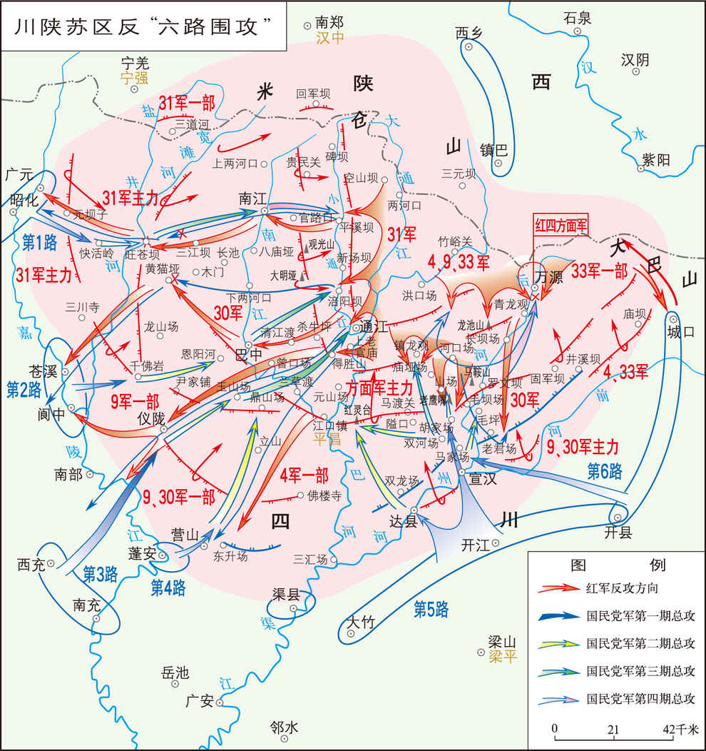 土地革命战争时期,中国工农红军第四方面军在四川省北部地区反击国民党四川军阀部队围攻川陕苏区的作战。 国民党军以重兵围攻苏区,红四方面军采取收紧阵地、待机反攻的作战方针 1933年2~10月,红军第四方面军在总指挥徐向前、政治委员陈昌浩指挥下,连续取得反“三路围攻”和仪南、营渠、宣达三次进攻战役...