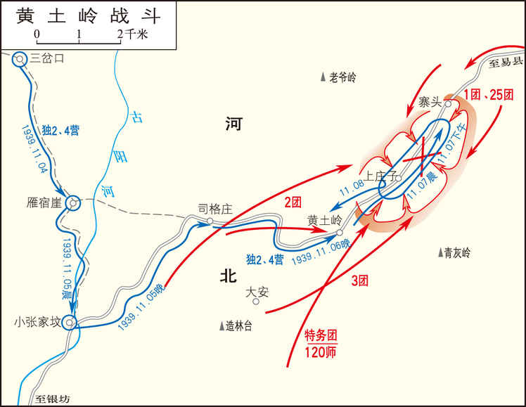 抗日战争时期,八路军晋察冀军区和第120师各一部在河北省涞源县城东南黄土岭地区对日军进行的伏击战。 1939年10月下旬,日军华北方面军第110、第26师、独立混成第2、第3、第8旅各一部,共2万余人,分多路对晋察冀抗日根据地北岳区进行冬季“扫荡”。11月3日,由涞源城出动的日军独立混成第...