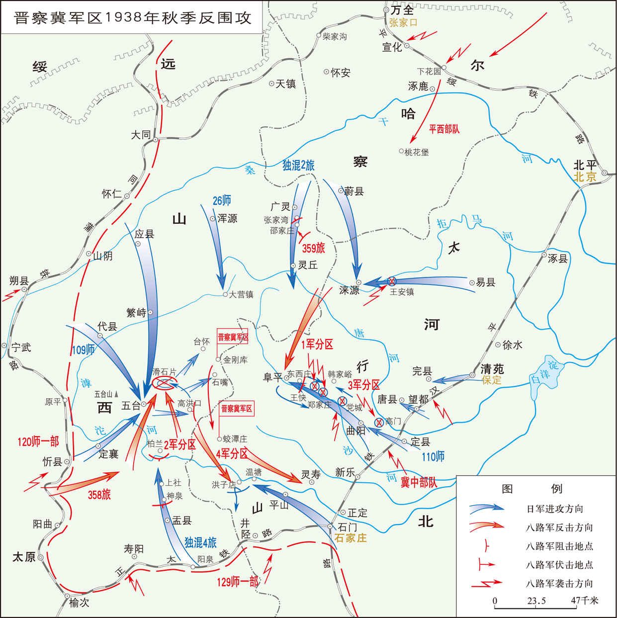 抗日战争时期,八路军晋察冀军区部队和第120师一部,在晋察冀边区反击日军大规模围攻的作战。 1938年秋,日军华北方面军司令官寺内寿一为策应进攻武汉、广州的作战,调集第110、第26、第109师和独立混成第2、第4旅等部共5万余人,采取先分进合击、逐步推进、压缩包围,尔后分割“清剿”、各个击破...