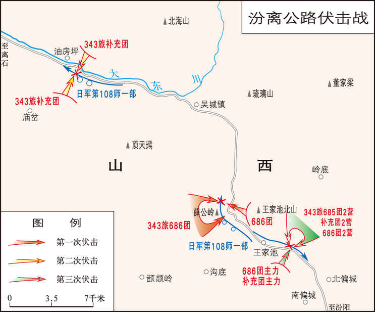 抗日战争时期,八路军第115师第343旅在山西省汾(阳)离(石)公路上三次伏击日军的战斗。 1938年9月上旬,日军华北方面军为围攻晋察冀边区和策应华中派遣军进攻武汉,以第108师一部沿汾离公路西犯,先后占领离石及黄河左岸一线,企图进犯陕甘宁边区的黄河防线。第115师根据八路军总部关于破坏日军...