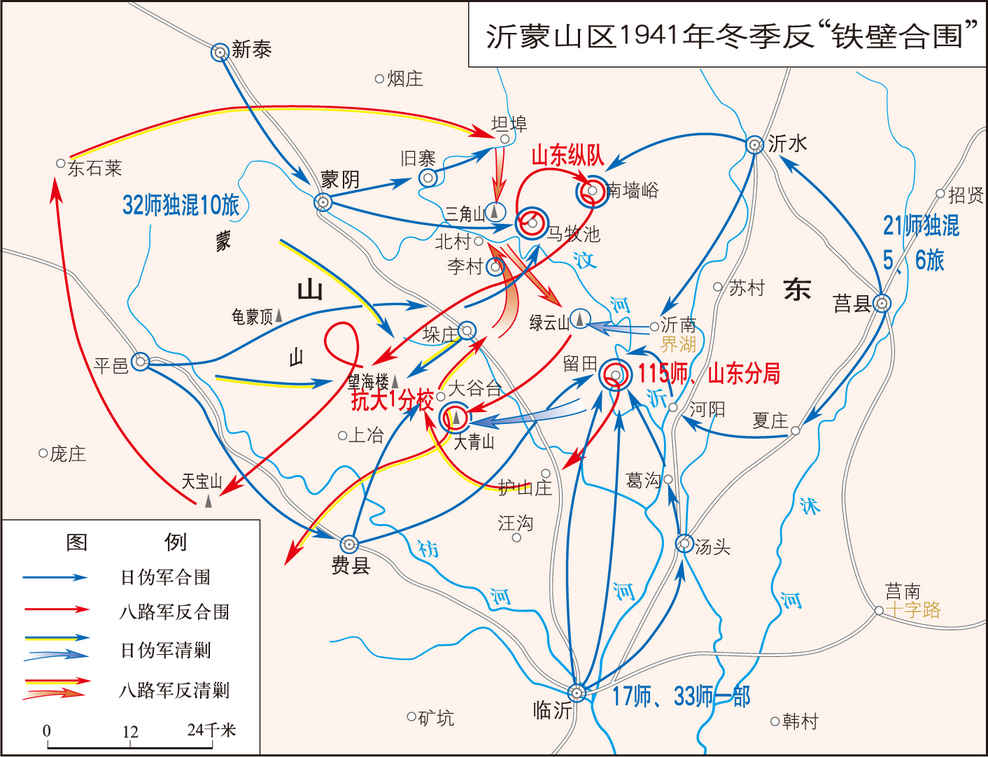 抗日战争时期,八路军第115师和山东纵队在山东省沂蒙山区反击日军大规模“扫荡”的作战。 1941年9~10月间,山东境内日军集中5万余人兵力,在第12集团军司令官土桥一次指挥下,准备对沂蒙山区抗日根据地进行“扫荡”。其中,第32师和独立混成第10旅主力配置于新泰、蒙阴、平邑、费县地区,第21师...