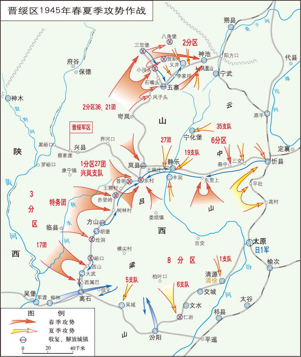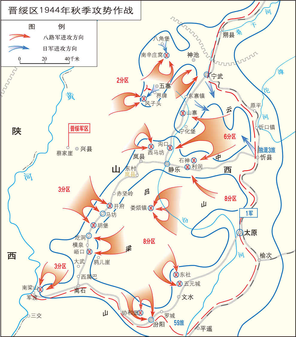 抗日战争时期,八路军第120师和山西新军一部,在山西省西北部粉碎日军大规模“扫荡”的战役。 1940年5月,日军为消灭八路军第120师主力,摧毁晋西北抗日根据地,遂调集独立混成第3、第9、第16旅主力及第26师一部,连同伪军共2.5万余人,采取“分进合击,连续突击”的战术,从东、北、南三面对晋...