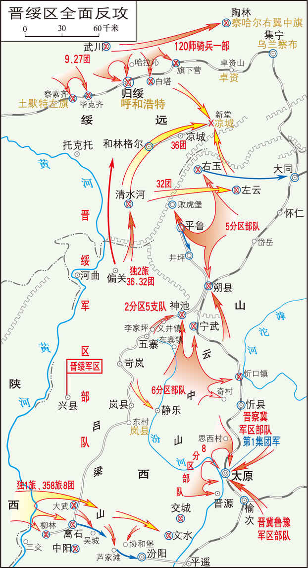 抗日战争时期,八路军驻晋绥区部队为收复被日伪军占领的城镇、控制交通要道、歼灭拒绝投降的日伪军,在战区内进行的全面反攻作战。 1945年8月上旬,世界反法西斯战争已临近最后胜利,中国的抗战形势空前有利。9日,中国共产党中央委员会主席毛泽东发表《对日寇的最后一战》的声明,号召中国人民的一切抗日...