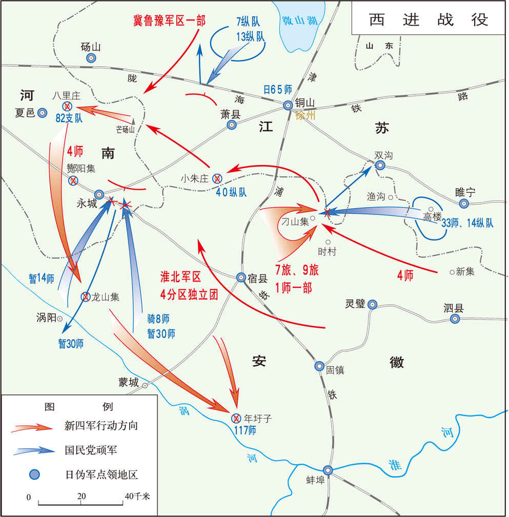 抗日战争时期,新四军第4师由淮北地区进军河南省敌后,恢复豫皖苏边抗日根据地的作战。 1944年春,日军为打通平汉铁路(今北京—汉口),向河南省发动进攻。国民党军40万大军溃败,河南广大地区沦入敌手。中共中央为发展河南敌后抗战新局面,拯救沦陷区人民,于6、7月间发出向河南敌后发展、控制中原的指示...