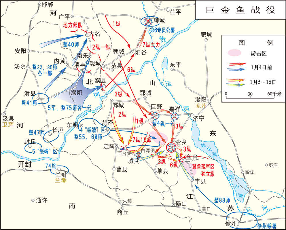 解放战争时期,中国人民解放军晋冀鲁豫野战军在山东省巨野、金乡、鱼台地区对国民党军进行的进攻作战。 1946年11月滑县战役后,国民党郑州“绥靖”公署主任顾祝同以所部第5军和整编第25、第32、第85、第40师等共9个旅,分由河南省滑县、安阳地区向濮阳、内黄及河北省大名等地进攻,企图寻晋冀鲁豫野...