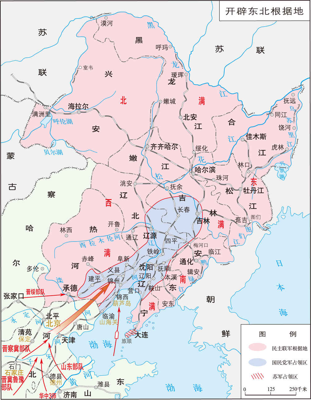 日本投降后,中国共产党领导的八路军、新四军各一部进军东北,抗击国民党军进攻,将东北建成战略基地的斗争。 东北地区(今辽宁、吉林、黑龙江省和内蒙古自治区东部、河北省东北部)幅员辽阔,资源丰富,工业发达,交通便利;北靠苏联,西接蒙古,东邻朝鲜,南与华北相连,并与山东解放区隔海相望,战略地位十分重要...