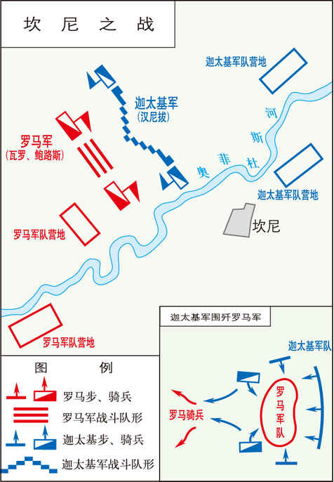 第二次布匿战争期间,迦太基军队与罗马军队在坎尼附近进行的会战。特拉西梅诺湖之战后,迦太基统帅汉尼拔率军南下,于公元前216年4月攻占意大利南部阿普利亚境内的罗马粮食和物资供应基地坎尼。罗马执政官瓦罗和鲍路斯率军赶赴坎尼迎战汉尼拔。8月2日,会战在奥菲杜斯河(今奥凡托河)下游左岸平原展开。罗马...