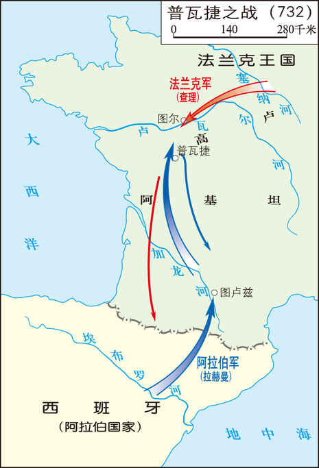 法兰克王国军队同入侵的阿拉伯军队在普瓦捷和图尔之间地域进行的交战。又称图尔之战。711年阿拉伯帝国军队由北非渡海灭日耳曼人的西哥特王国后,占领西班牙全境,并多次入侵高卢南部的阿基坦。732年初,阿拉伯驻西班牙总督阿卜杜勒·拉赫曼率军5万由西班牙再次侵入阿基坦。阿基坦公爵奥多阻挡不住阿拉伯军队...