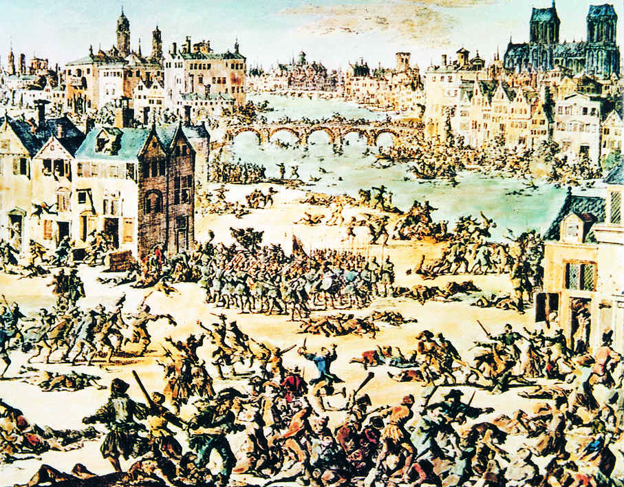 16世纪下半叶,法国天主教派同胡格诺派进行的多次内战。圣巴托罗缪节大屠杀(油画) 16世纪五六十年代,随着部分贵族改宗新教(胡格诺派),法国逐渐形成以纳瓦尔国王亨利、孔代亲王亨利一世、海军上将G.de科利尼为代表的胡格诺派和以吉斯公爵、J.d,A.圣安德烈元帅及蒙莫朗西公爵为首的天主教派对立的...