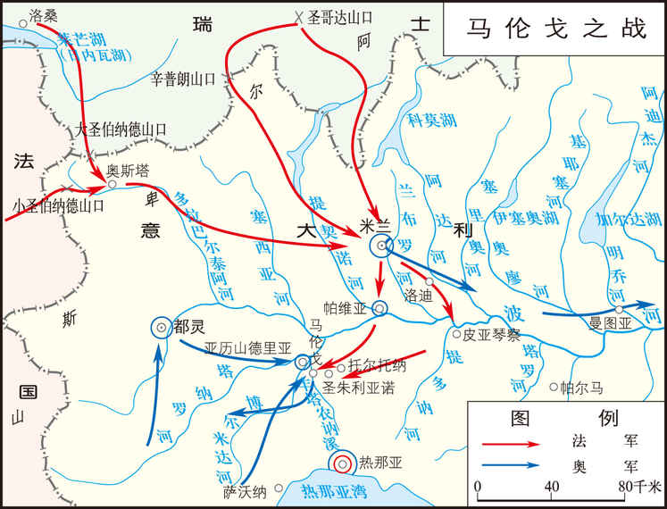 拿破仑战争期间,法国和奥地利军队于1800年6月在意大利北部马伦戈村进行的会战。 1799年11月拿破仑·波拿巴上台执政后,决心夺回在意大利失去的土地。1800年4月,奥军统帅M.梅拉斯在萨沃纳附近发动进攻,将法军A.马塞纳部压缩在热那亚要塞内,并企图西进法国南部。拿破仑决定率军从瑞士翻越阿尔...