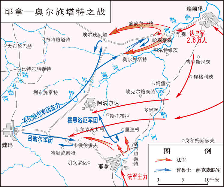 拿破仑战争期间,法军同普鲁士—萨克森联军于1806年10月在耶拿和奥尔施塔特两地进行的会战。1806年9月,英、俄、普等国结成第四次反法联盟后,普萨联军17万余人未等俄军到达即率先行动,分三路向西南推进:总司令不伦瑞克公爵率主力向维尔茨堡方向实施主攻,霍恩洛厄军团和吕谢尔军团分别保障其左翼与...