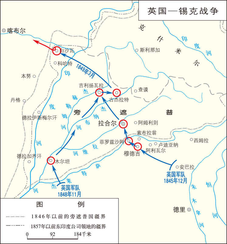 1845~1849年,英国殖民者对锡克人统治的印度旁遮普国发动的两次侵略战争。1843年英国征服信德后,即把侵略矛头指向印度次大陆最后一个独立的旁遮普国。第一次战争(1845~1846):战前,英印总督向旁遮普边境集结兵力4万人。锡克军约6万人,在数量上占优势,但下层官兵与将领之间矛盾尖锐,...