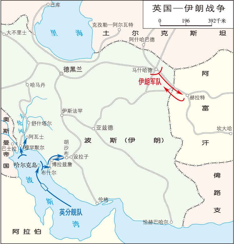 1856~1857年,英国对伊朗发动的侵略战争。19世纪上半叶,英国为向中亚地区扩张,与俄国争夺势力范围,极力反对伊朗在俄国支持下对赫拉特的征服。赫拉特位于印度通往中亚的交通要冲,具有战略意义。1837年,伊朗曾出兵围攻赫拉特,但在英国军事压力下被迫撤围。克里木战争期间,伊朗乘英国忙于对俄作战之...
