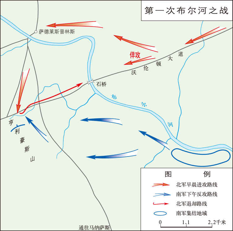 美国内战初期,北南双方于1861年7月在布尔河两岸进行的会战。又称第一次马纳萨斯之战。1861年4月内战爆发后,联邦军迟迟没有采取重大行动。南军则逐步向北进逼,于5月6日进驻马纳萨斯,威胁联邦首都华盛顿,北方舆论强烈要求向南部同盟“首都”里士满进军。5月24日,I.麦克道尔将军率联邦军主力3.5...
