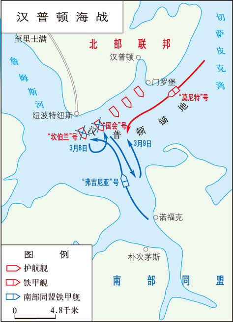 美国内战期间,北南双方于1862年3月在汉普顿锚地进行的一次海战。又称切萨皮克湾海战。1862年3月,美国联邦军从海路向里士满发动进攻,同时为保证陆军在詹姆斯河下游地区登陆,在该河河口的汉普顿锚地部署5艘大型护航舰和数艘炮舰进行封锁。3月8日午后,南部同盟军的“弗吉尼亚”号铁甲舰(由“梅里马...