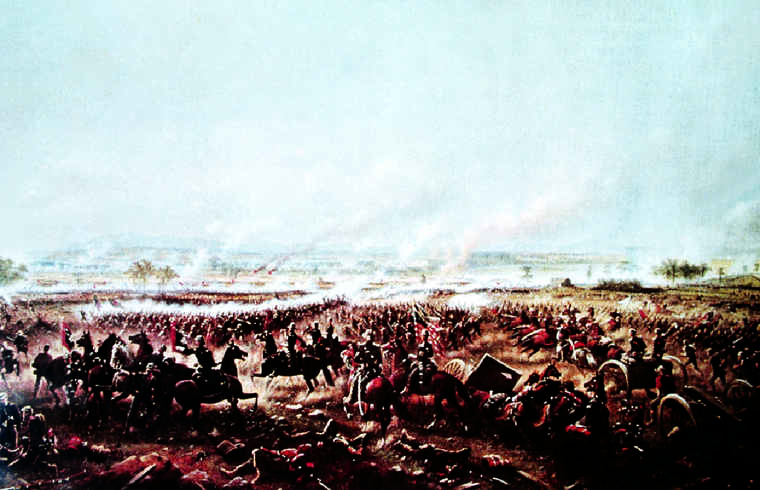 美国内战期间,北南双方于1863年7月初在宾夕法尼亚州葛底斯堡进行的具有转折意义的会战。1863年6月,南部同盟军将领R.E.李在接连击溃联邦军后,率部7.6万人攻入宾夕法尼亚州,企图占领哈里斯堡,夺取给养和装备,进而威胁联邦政府首都华盛顿,促使英法等欧洲列强承认南部同盟政府。联邦军G.G.米德...