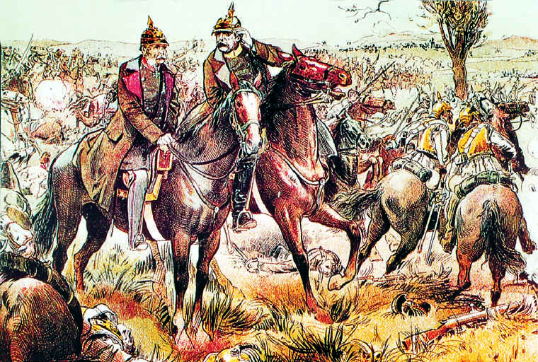 1866年,普鲁士为争夺统一德意志的领导权对奥地利进行的战争。又称七周战争。威廉一世与首相俾斯麦随军观战(油画) 1864年,普奥联军打败丹麦,迫其放弃对石勒苏益格—荷尔斯泰因的主权要求并承认由普、奥共管。普鲁士为发动对奥战争,积极开展外交活动,争取法、俄中立并与意大利结盟。1866年6月,普...