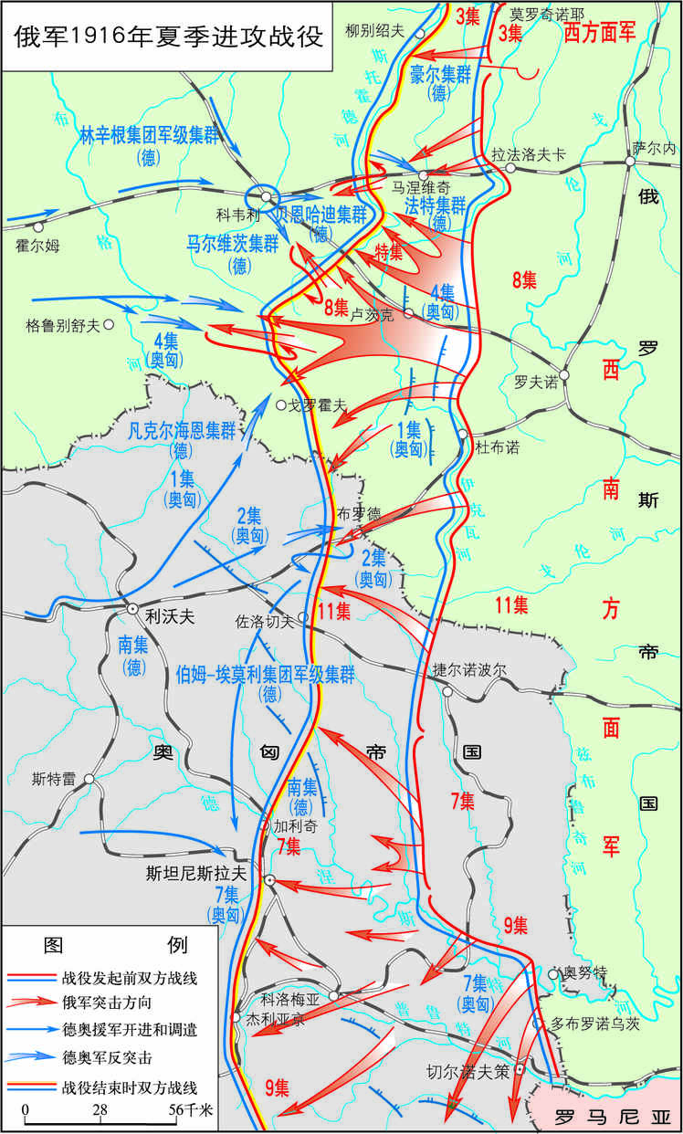 第一次世界大战期间,俄军于1916年夏季对德奥联军实施的进攻战役。又称俄军西南方面军夏季进攻战役或布鲁西洛夫突破。 1916年4月,俄军大本营根据协约国尚蒂伊军事会议达成的协议,计划于6月中旬发动大规模进攻,以西方面军向维尔诺方向实施主攻,以北方面军和西南方面军实施助攻。俄西南方面军(辖第8、...