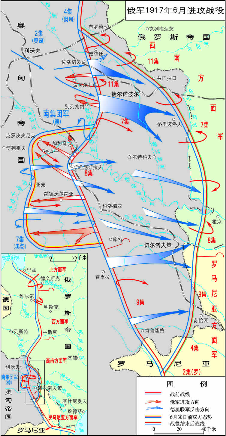 第一次世界大战期间,俄军于1917年6~8月对德奥联军实施的进攻战役。1917年3月,俄国爆发资产阶级革命,沙皇政府被推翻,代表地主资产阶级利益的临时政府掌权。临时政府为巩固其统治,配合西线英法联军作战,决定于6月对德奥联军发动大规模进攻。其企图是:以西南方面军(辖第11、第7、第8集团军,共6...