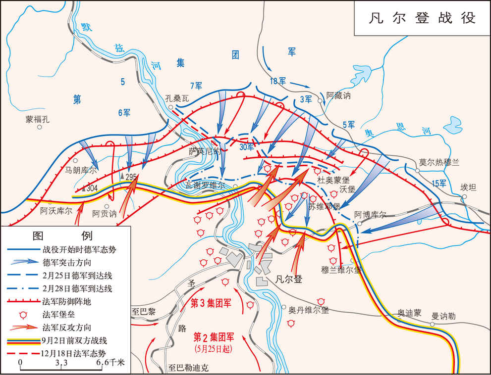 第一次世界大战中,德军和法军于1916年2~12月在法国凡尔登筑垒地域进行的战役。 战役企图和兵力部署 1916年初,德军统帅部计划在东线进行防御,集中兵力对西线法军的凡尔登突出部实施突击,以牵制和消耗法军主力,迫使法国投降。受领进攻任务的部队是德国皇太子威廉指挥的第5集团军(辖7个军共18个...