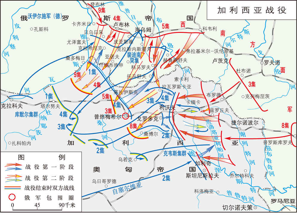 第一次世界大战初期,俄军西南方面军与奥军于1914年8~9月在奥匈帝国加利西亚地区进行的一系列交战。 1914年8月上旬,西线战事全面展开,俄国大本营应盟国要求,在发起东普鲁士战役(1914)的同时,决定以西南方面军(辖第4、第5、第3和第8集团军,共36.5个步兵师、12.5个骑兵师,后增至...