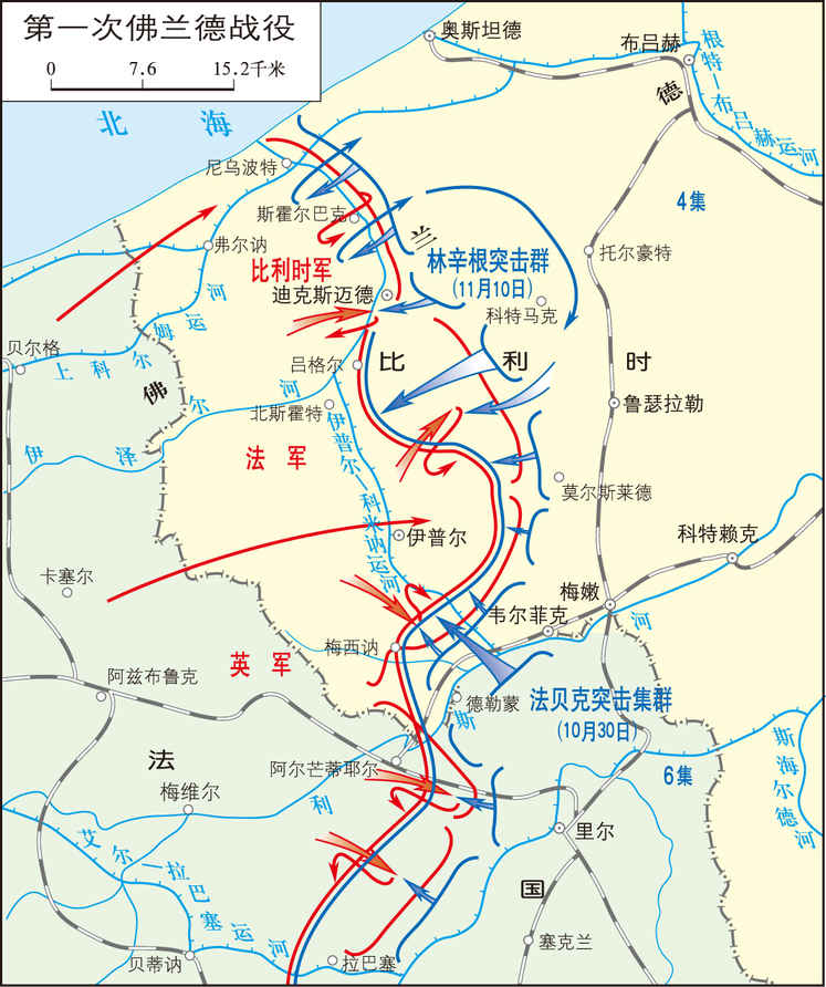 第一次世界大战期间,德军与协约国军队于1914年和1918年在比、法边境佛兰德地区进行的两次战役。 第一次战役 1914年10月中旬“奔向大海”战役结束后,战线从利斯河延伸到伊泽尔河。德军计划攻占法国加来海峡港口城市,摧毁英军补给基地,迫使英国退出战争。协约国军队决心坚守伊普尔、迪克斯迈德、尼...