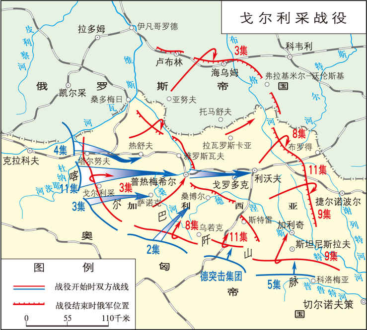 第一次世界大战期间,德奥联军于1915年5~6月在奥匈帝国加利西亚西部地区对俄军西南方面军实施的进攻战役。又称戈尔利采突破。1915年4月喀尔巴阡战役结束后,奥匈帝国面临俄军入侵和意大利参战的压力,处境极为困难。德军统帅部为支援奥匈,稳定东线,决定从西线调兵,对俄军西南方面军右翼实施大规模进攻,...