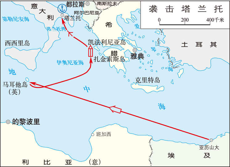 第二次世界大战中,英国地中海舰队舰载航空兵于1940年11月11日对意大利海军基地塔兰托进行的袭击战。塔兰托位于意大利东南部,是意大利海军的主要基地。1940年6月10日意大利向英法宣战后,英国在地中海的交通运输受到意舰队威胁。同年秋,英地中海舰队决定袭击塔兰托,削弱意舰队实力,以确保英国海...