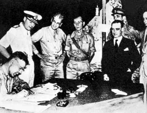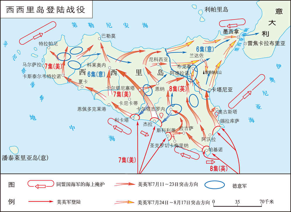 第二次世界大战期间,盟军于1943年7~8月在意大利西西里岛实施的大规模登陆作战。 1943年1月美英卡萨布兰卡会议决定,北非战局结束后,盟军在西西里岛登陆。目的是占领该岛,以保证同盟国地中海航线畅通,促使苏德战场德军西调,并迫使意大利投降。战役由盟军驻北非部队负责实施,总司令为D.D.艾森豪...