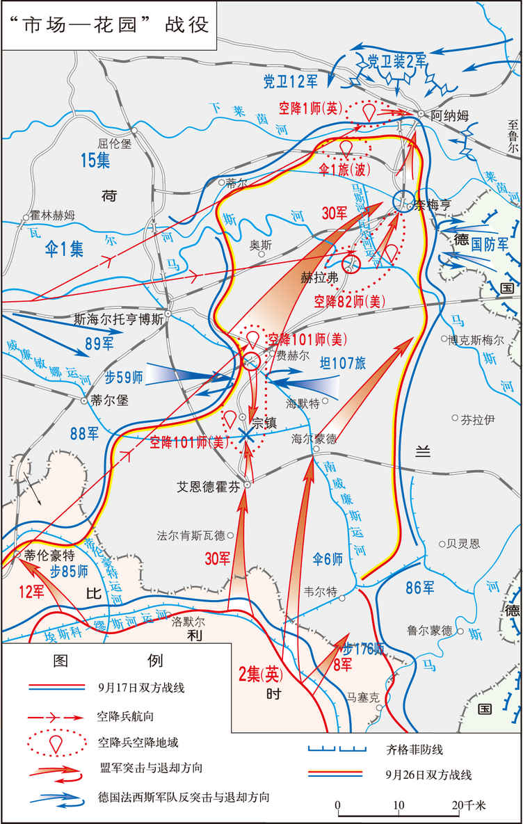 第二次世界大战中,盟军于1944年9月在荷兰艾恩德霍芬至阿纳姆地域实施的进攻战役。又称阿纳姆空降战役。其企图是占领阿纳姆,为盟军第21集团军群迂回齐格菲防线,进军德国北部开辟道路。计划规定:盟军第1空降集团军(辖美国第82、第101空降师,英国第1空降师,波兰第1伞兵旅,司令为L.H.布里尔...