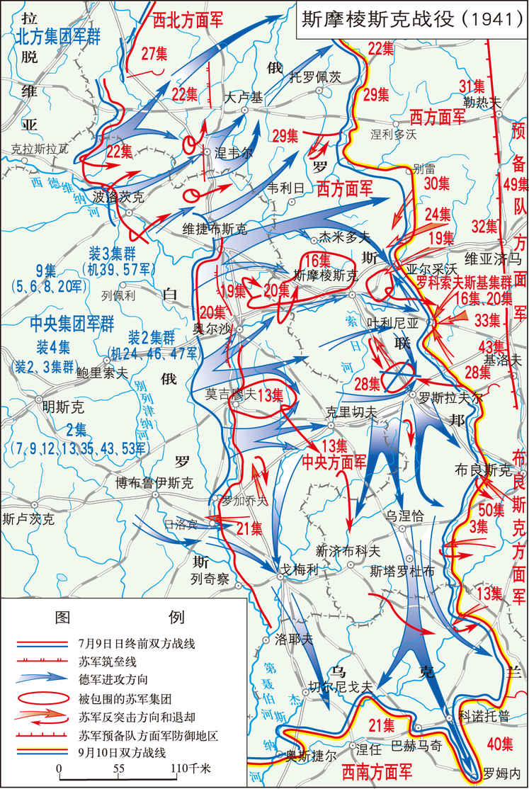 苏德战争中,苏德两国军队于1941年7月10日~9月10日在斯摩棱斯克地域实施的攻防战役。德军继比亚韦斯托克─明斯克战役之后,企图以中央集团军群(司令为F.von博克元帅)围歼苏军斯摩棱斯克集团,夺取西德维纳河与第聂伯河之间地带,打开通向莫斯科的门户。其参战兵力为60个师又1个旅及1个航空队...