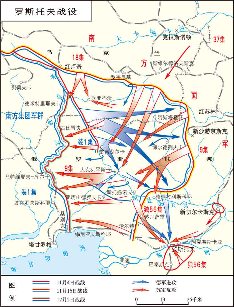 苏德战争期间,苏德两国军队于1941年11月5日~12月2日在罗斯托夫地域实施的攻防战役。德军南方集团军群(司令为K.R.G.von伦德施泰特元帅)占领顿巴斯西南部后,企图以一部兵力围歼苏军罗斯托夫集团,打开通向高加索的门户。苏军南方面军(司令为Y.T.切列维琴科上将)和独立第56集团军(11月...