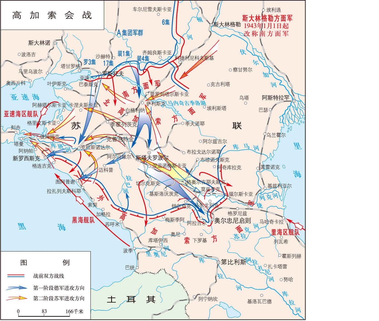 苏德战争中,交战双方于1942年7月25日~1943年10月9日在高加索地区实施的一系列攻防战役。为夺占盛产粮食和石油的高加索并进而侵入中近东地区,德军统帅部命令A集团军群(辖第1和第4装甲集团军、第17集团军、罗马尼亚第3集团军、第4航空队部分兵力,共16.7万人、坦克1130辆、火炮和迫击炮...