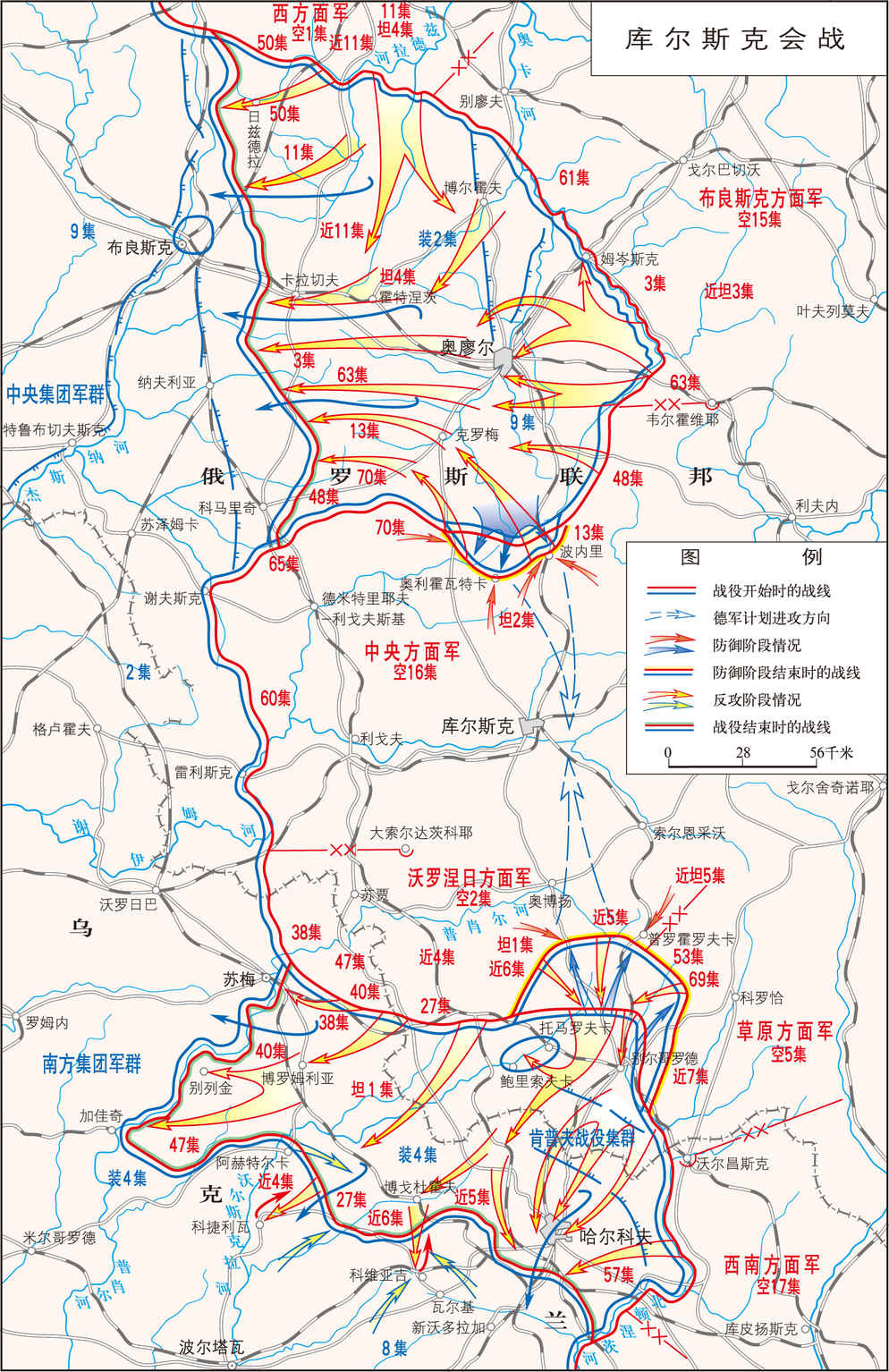 苏德战争中,苏军于1943年7月5日~8月23日在库尔斯克突出部地域实施的战略性防御和进攻战役。 双方企图和兵力部署 德军在斯大林格勒会战失败后,为摆脱困境、防止轴心国集团土崩瓦解,决定在苏德战场发动大规模夏季进攻,以夺回战略主动权。德军统帅部考虑到德军在库尔斯克突出部地域所处的有利态势,决定...