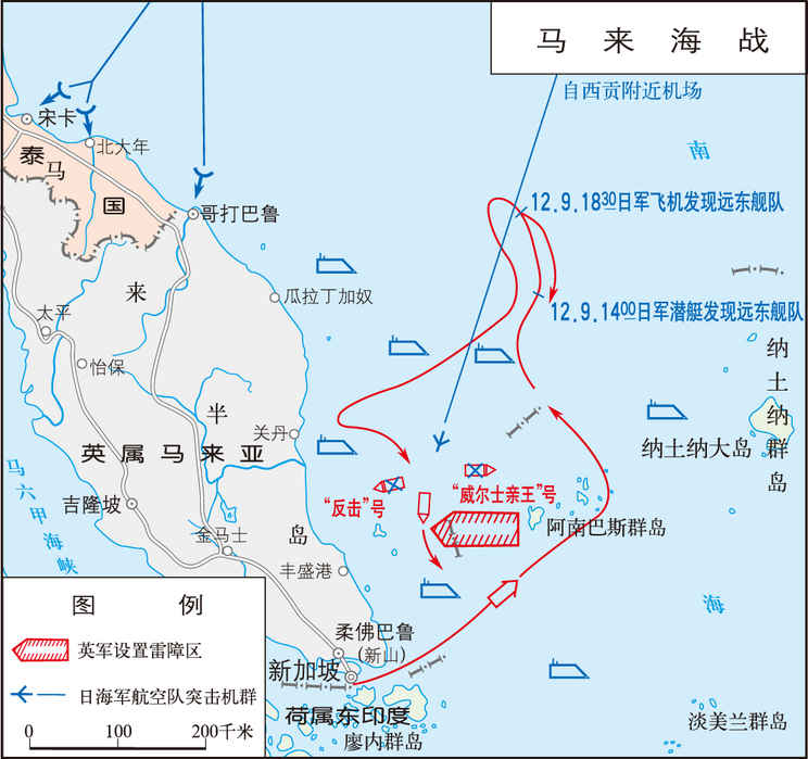 太平洋战争初期,日本海军陆基航空兵于1941年12月10日在马来半岛关丹附近海域对英国远东舰队进行的海上作战。12月8日,山下奉文中将指挥的日军第25集团军在泰国的宋卡、北大年和马来亚的哥打巴鲁登陆。英远东舰队司令T.菲利普斯闻讯后率舰队(由“威尔士亲王”号战列舰、“反击”号战列巡洋舰和4艘驱逐...