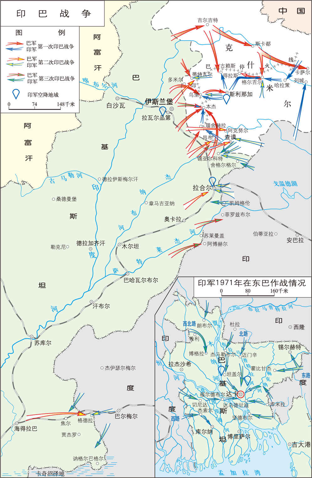 第二次世界大战后,印度和巴基斯坦之间发生的3次战争。 第一次战争(1947~1949) 1947年8月,印、巴分治,但查谟和克什米尔地区的归属问题悬而未决。该地区面积约19万平方千米,分治前为印度最大的土邦之一,战略地位十分重要。分治后,印度认为克什米尔邦的大君是印度教徒,应划归印度;巴基斯坦...