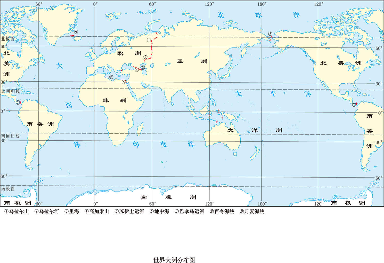 大陆及其附属岛屿组成的地理区域。划分陆地的最大地理单元,具有明显的社会特征。全球六块大陆及其周围岛屿分为七大洲。按面积大小,依次为亚洲、非洲、北美洲、南美洲、南极洲、欧洲和大洋洲。亚洲与欧洲之间以乌拉尔山脉—乌拉尔河—里海—高加索山脉—黑海海峡为界;亚洲与非洲以苏伊士运河为界;欧洲与非洲之间以地...