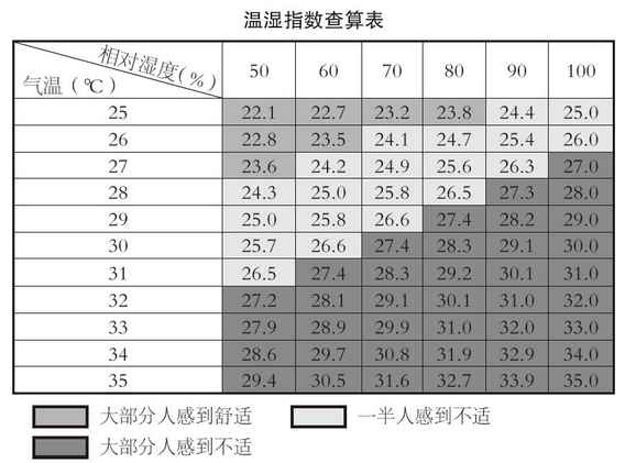 在不同气象条件下对人体舒适程度的一种量度。在不考虑风速影响的条件下,温湿指数主要受大气温度、湿度制约,通常用以下公式计算: THI=t-0.55(1-RH)(t-14.5) 式中t为气温(℃),RH为相对湿度。 温湿指数反映了群体的人对环境的热感受。当夏季的THI≤21.1时,几乎无人有不...