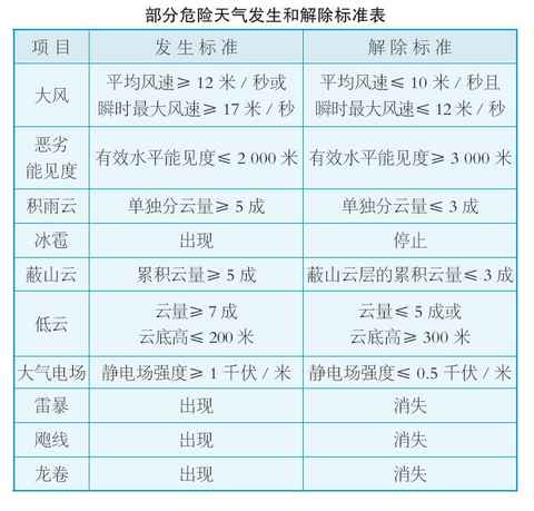 危及作战和其他军事活动,以及人员、设施、武器装备安全的恶劣天气。主要指达到规定标准的恶劣能见度、大风、低云、积雨云、雷暴、冰雹、强大气电场、飑线、龙卷、沙尘暴、雪暴、雨凇等,还包括热带风暴、台风、暴雨、寒潮和中度以上飞机积冰、飞机颠簸等。危险天气项目和标准,通常由军队各级司令部根据作战、训练等军...