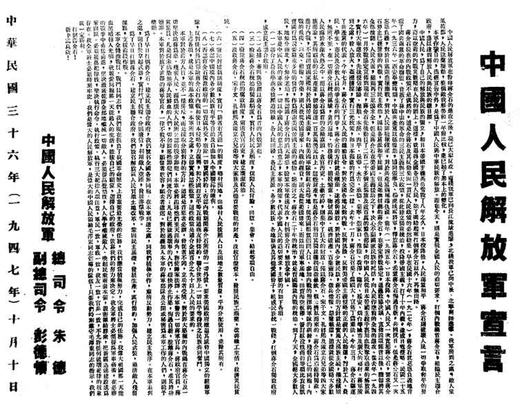 1947年10月10日中国人民解放军总部发布的政治文告。又称《双十宣言》。毛泽东在陕北葭县(今陕西省佳县)神泉堡起草。发布时朱德、彭德怀署名。刊于当日《人民日报》,1960年收入《毛泽东选集》第4卷。 1947年7月,解放战争进入第二年,人民解放军由战略防御转入战略进攻。为进一步争取广大人...